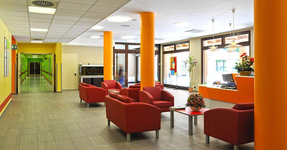 al piano terra i visitatori trovano accoglienza nella hall, ampia e luminosa.